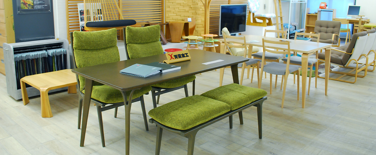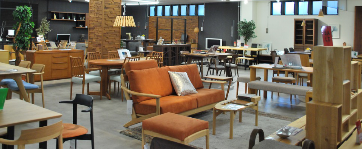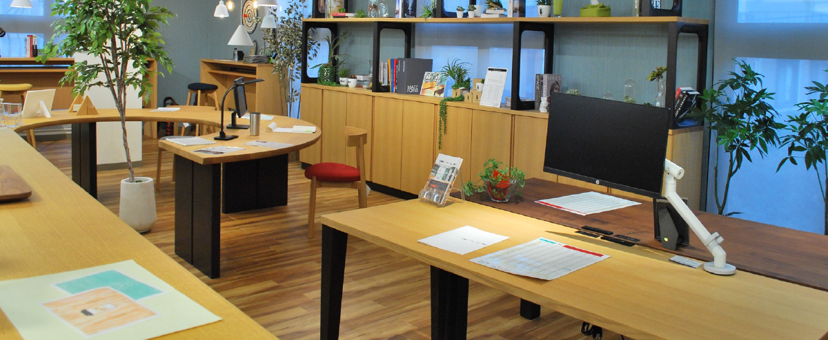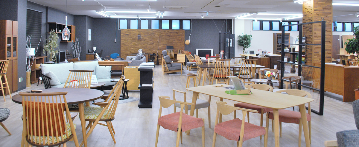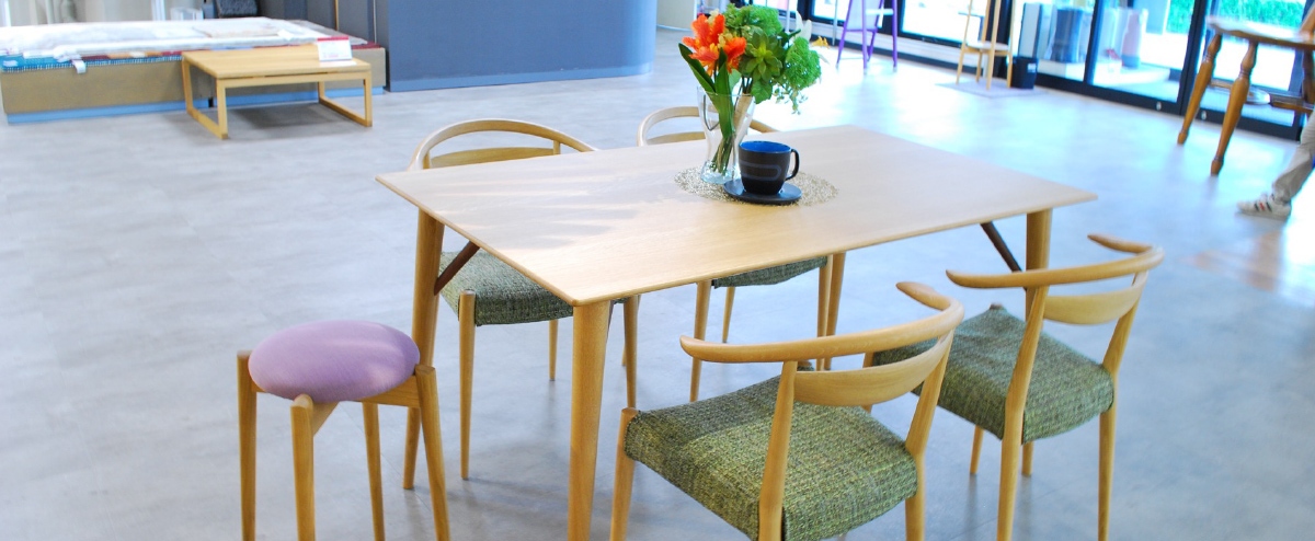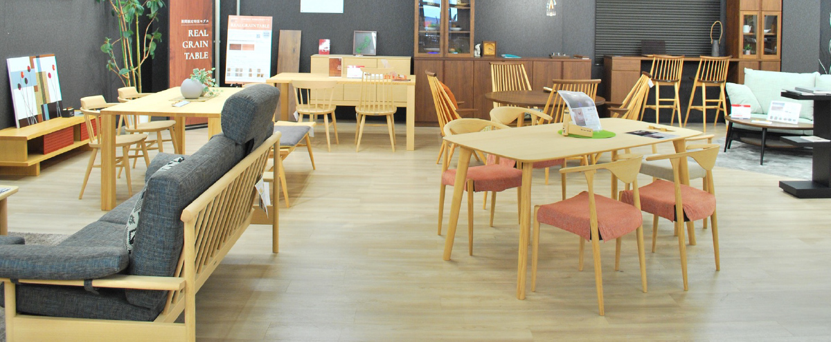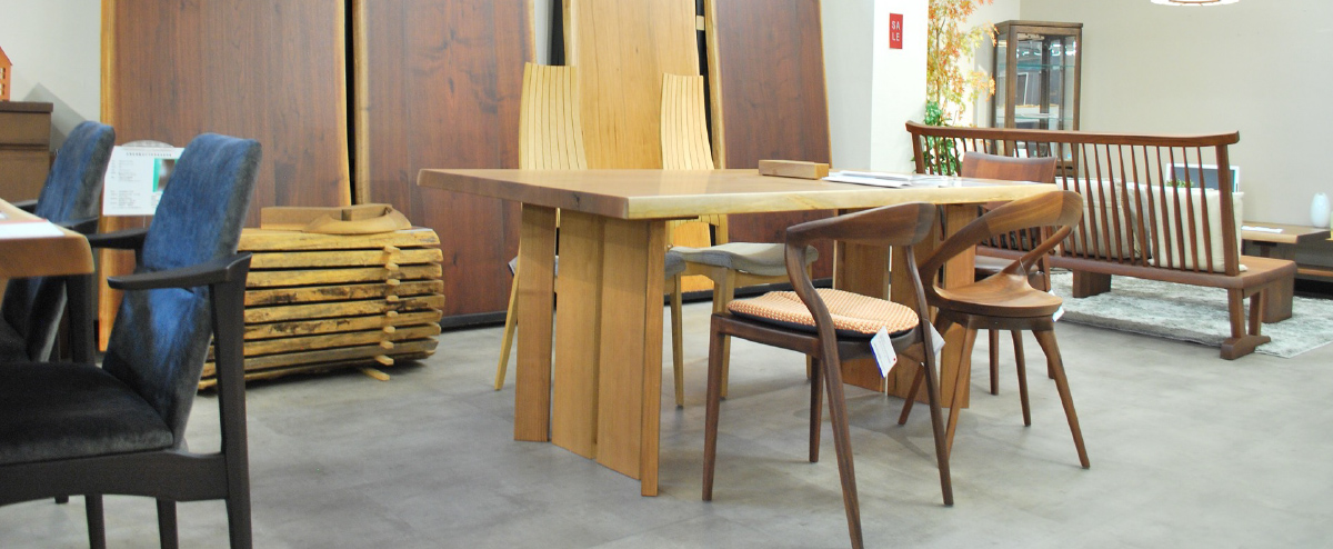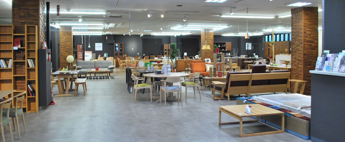 1Fは日本有数の家具産地である岐阜県飛騨高山地区の家具メーカーと当社オリジナルブランド”I SELECT”を中心に展示。いずれも材質・手法・デザイン等にこだわりのつまったラインナップです。