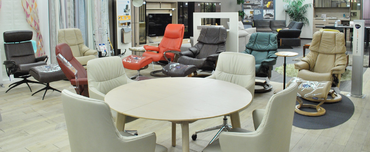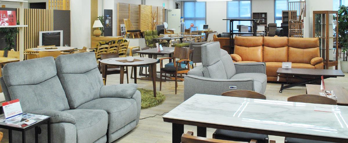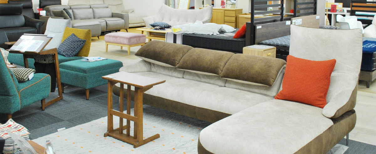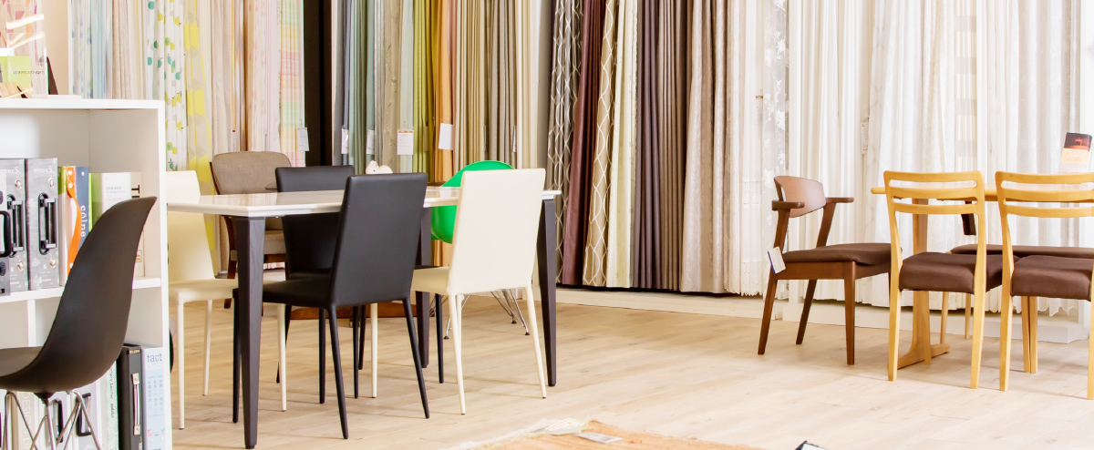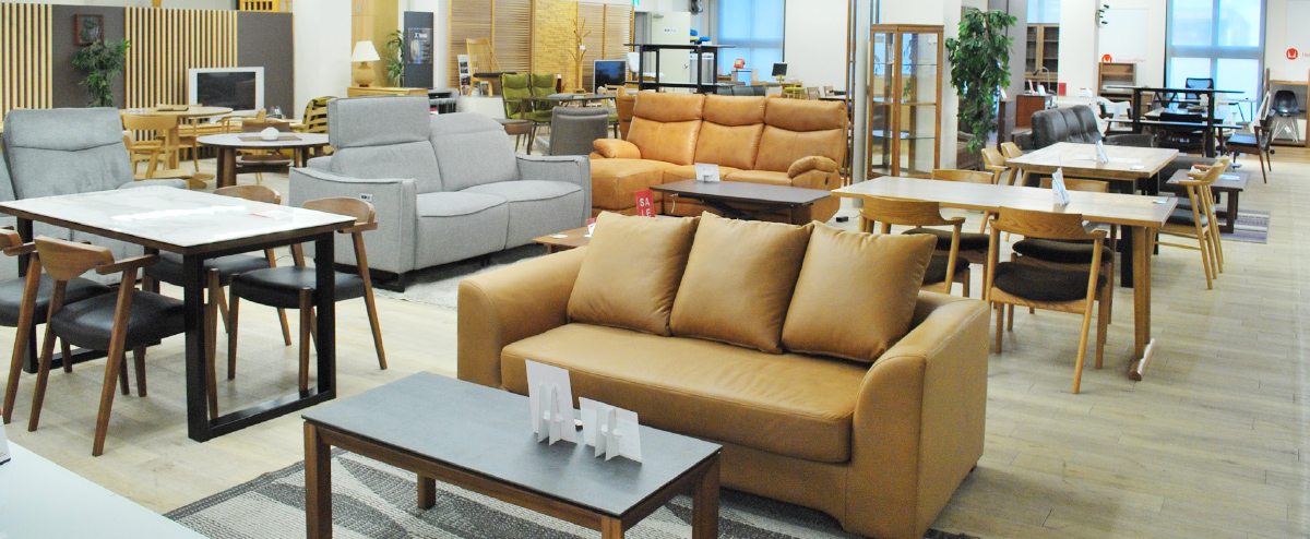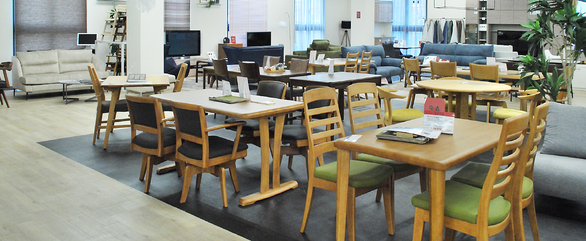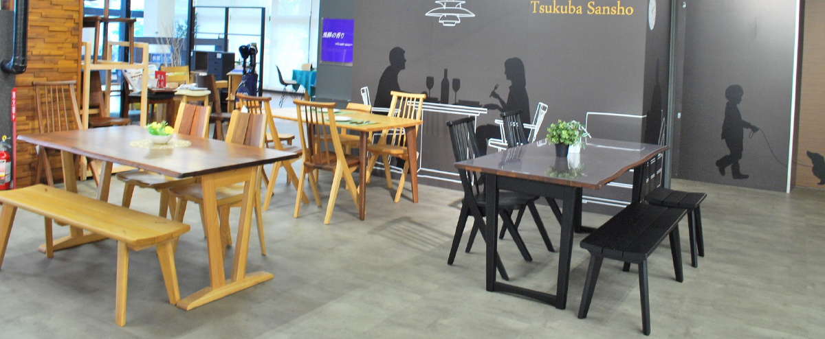 筑波産商ショールームは、3階建て総床面積約750坪にダイニングルーム、リビングルーム、ベッドルームに必要な家具から、カーテンや小物まで全て取り揃えております。