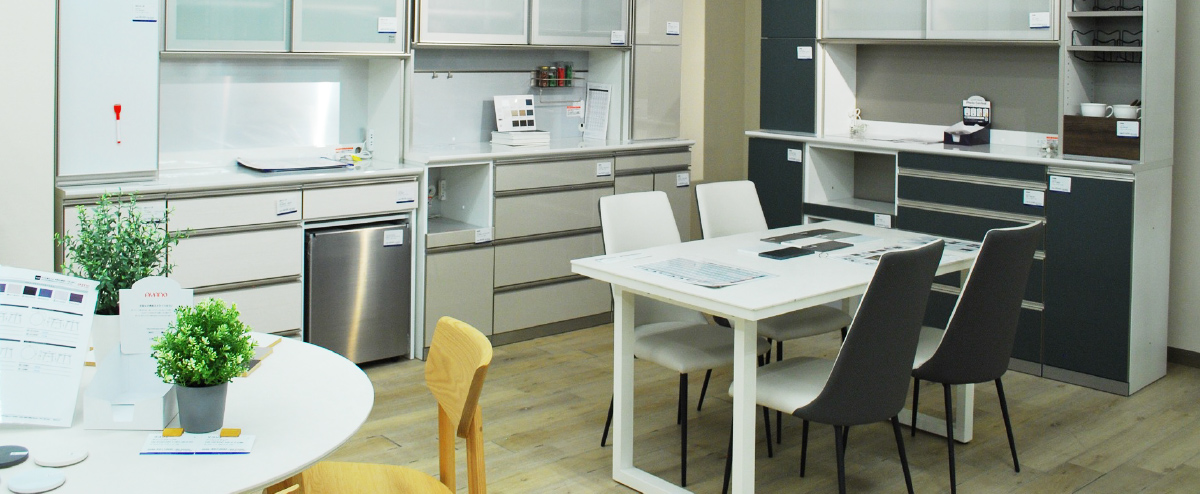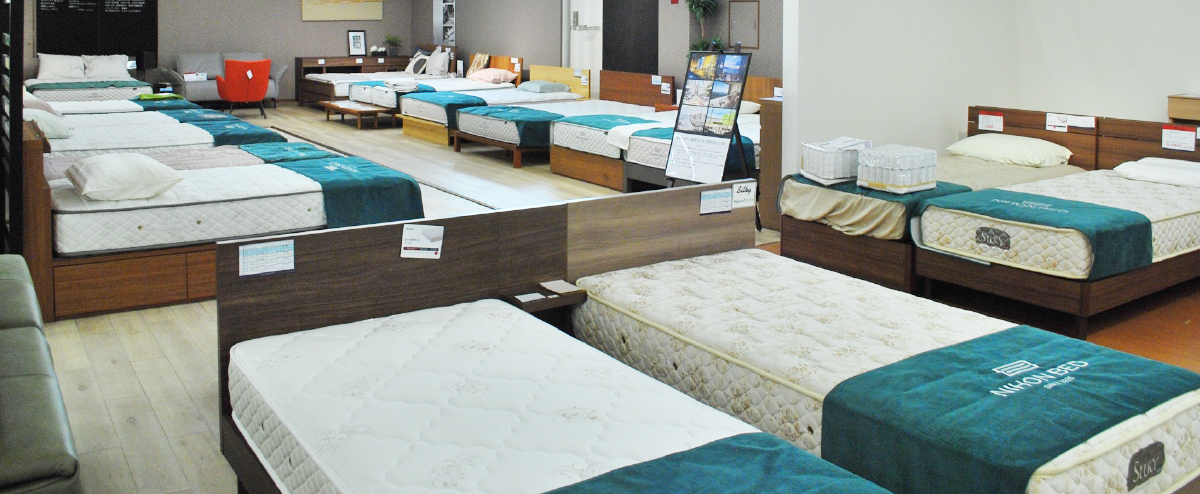 ベッドブースは実際に横になって多彩な寝心地を体感いただけます。そのほか機能性、清潔感、バリエーション豊富な食器棚・リビングボードも2Fの展示です。