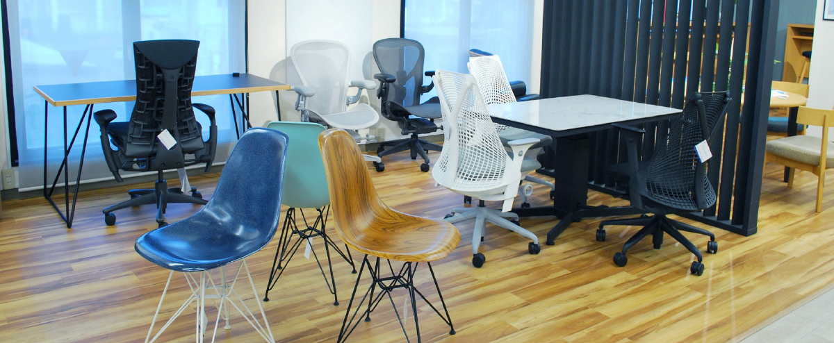 海外の家具メーカーの商品を多数展示しており、その独特なデザインや色彩、使い心地を体感いただけます。そのほかリビングオフィス提案ブースやカーテンブースも3Fに展示しています。